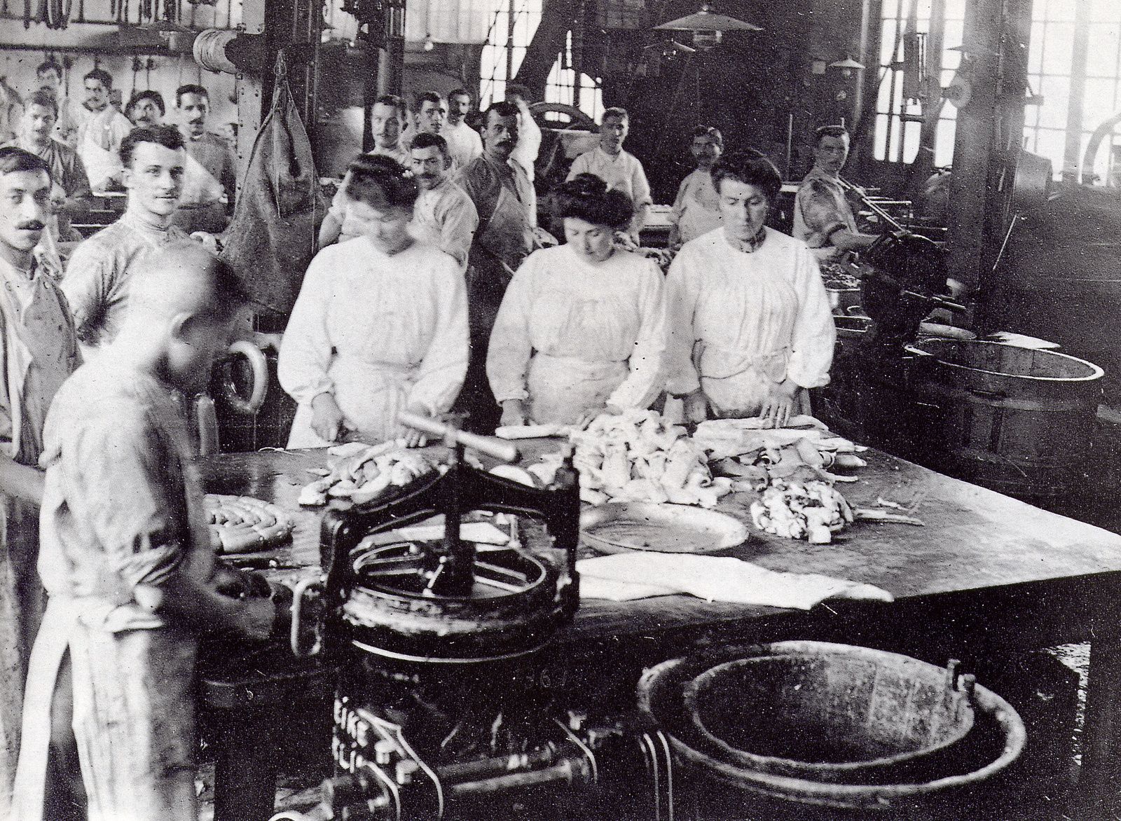La préparation des pièces à l'atelier au rez de chaussée, et celle des viandes et abats à l'atelier au sous-sol sont assurées par 70 hommes en majorité bouchers et charcutiers professionnels et 30 femmes